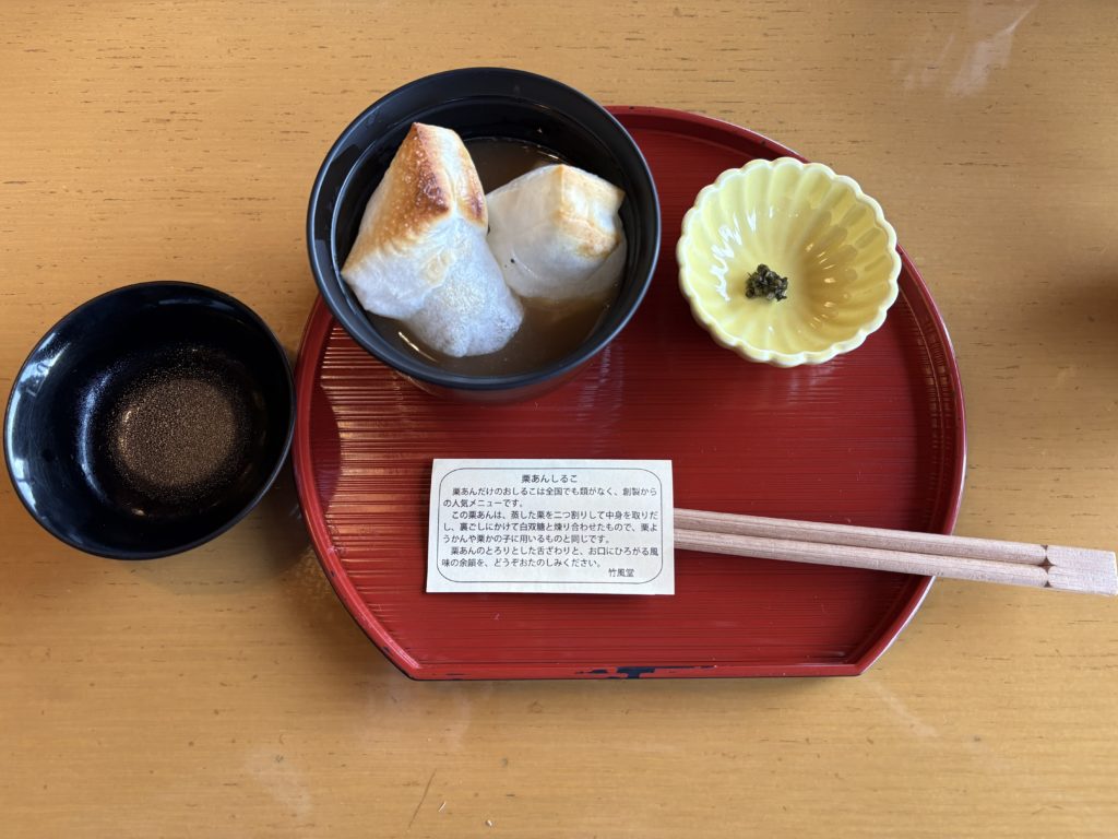 A Japanese dessert, “Kurian Shiruko,” is a boiled and mashed chestnut dish with sugar. Though “Shiruko” is usually made with red beans, here you can also taste “Shiruko” made with chestnuts. This picture shows a “Kurian Shiruko with baked rice cakes”.